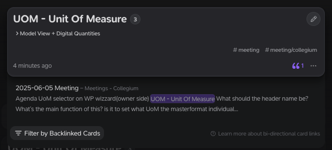- When creating a new meeting (as the meeting starts) 1. Search “Daily Standup Meetings” card and open it. 2. create the new note for the meeting as a child, which would automatically have the parent note (specific meeting category) set properly. 3. Not have to add multiple tags from memory at the start of my meeting (#meeting #daily-standup #work)