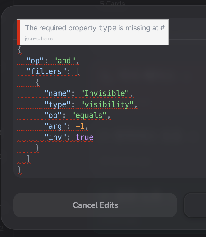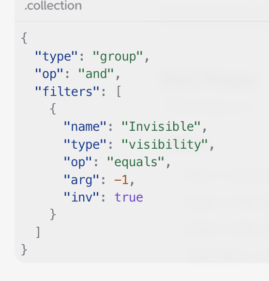 If I create a new custom collection at home, using “Create a collection from current view / filters”, its filter JSON is invalid by default.