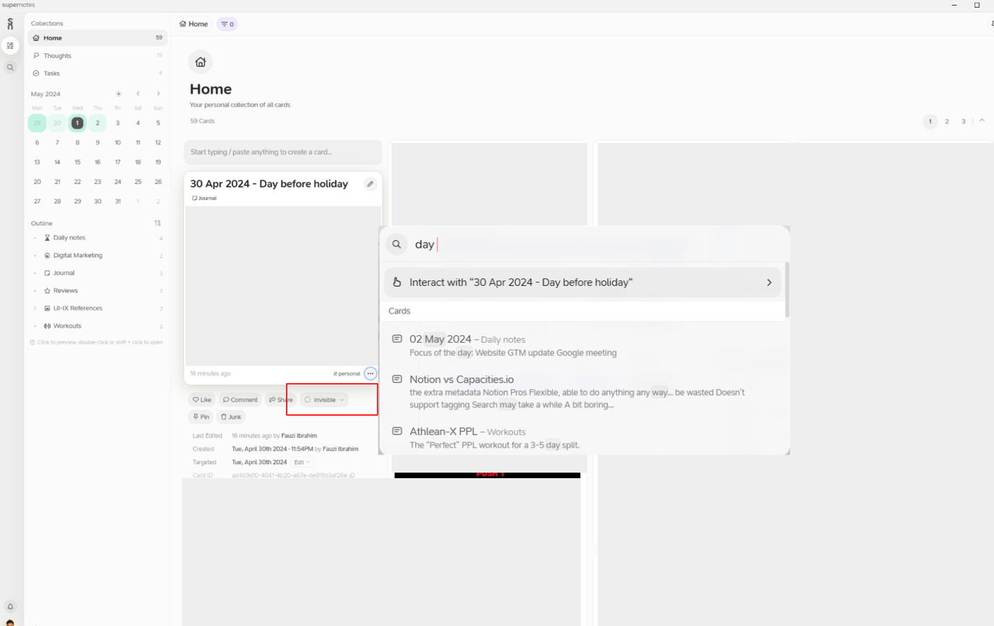 I have 2 invisible cards, the one that’s titled “30 Apr 2024”, can be searched and has a result listed even though it’s invisible but another card titled “Passport details” doesn’t show up at all. Is this expected behaviour?