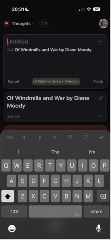 Copying a link or string of text and pasting into an empty card caused duplication. As the screenshot shows the pasted text both appears in the title of one card below and also is pasted into the body of another card above. The action appears to close the editing of the first one (with text in title) and leaves the second card open and in progress for editing.